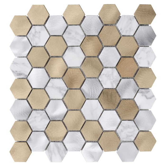 TDH32MDR White Calacatta Marble Champagne Gold Aluminum Metallic 1.5" Hexagon Mosaic Tile